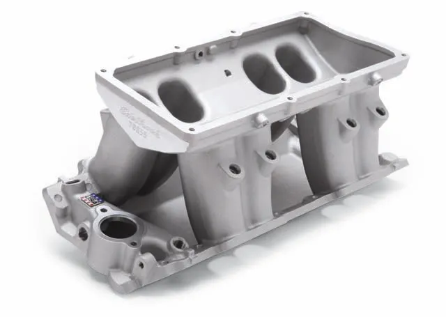 The Edelbrock Victor Tunnel Ram is an updated design to the popular Victor Ram 2-R Tunnel Ram, which was first released over 35 years ago. It’s designed for use with 468-582 c.i.d. standard-deck Chevrolet V8 engines with conventional rectangular port cylinder heads. This new and improved design has seven inch long runners with close to 5.5 square inches at the plenum, making it 25 percent larger than the current Victor Ram 2-R Tunnel Ram base. It is available for both carbureted (#7085) and fuel injected (#70855) applications. The fuel injected version features EFI bosses that are placed higher up on the runner for maximum horsepower.