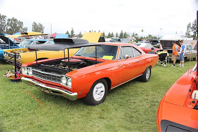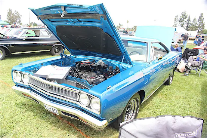 Top: We're told that scale model is an original wind tunnel model, quite valuable. Our friend {link=https://www.streetmusclemag.com/features/car-features/one-owner-1969-plymouth-roadrunner-is-both-beauty-and-beast/}Paul Polenz brought out his 'one owner' Roadrunner{/link} to the show.<br /> Bottom: Two things you don't see often - the four-bucket first gen Charger, and a fuel injected six-pack 'Cuda.