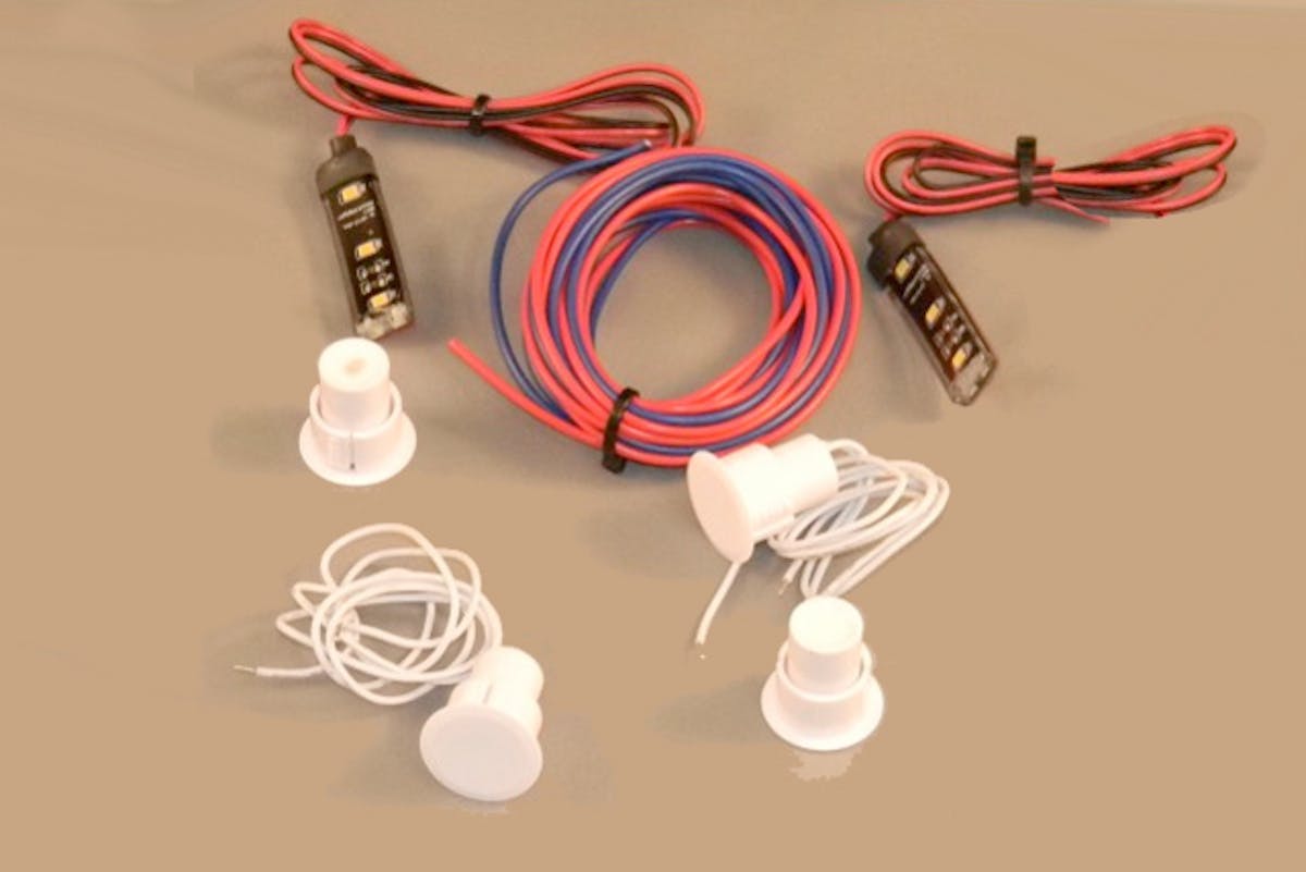 To install, simply drill the holes in the door and body side locations and mount the two components of the magnetic switch, and the body side magnet will contain the wiring to the vehicle’s electrical system. Pappas tells us that the kit will work on any car, especially those with fiberglass body shells, and the receptacles simply snap into place.