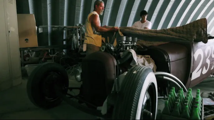 The video itself has that kind of short story, short film vibe. It starts off with a father and son in an old garage. It’s a dream scenario for many of us as dad is telling his teenage/young adult son about grandpa’s old racecar and how grandpa never lost a race behind the wheel. The cover’s pulled off to reveal a slick looking Roadster, with just enough patina to seem plausible. The car has a flat head V8, three carbs, bomber seats, whitewalls and sidepipes. With the exception of the more modern appearing alternator, it jives with dad’s tale fairly well.