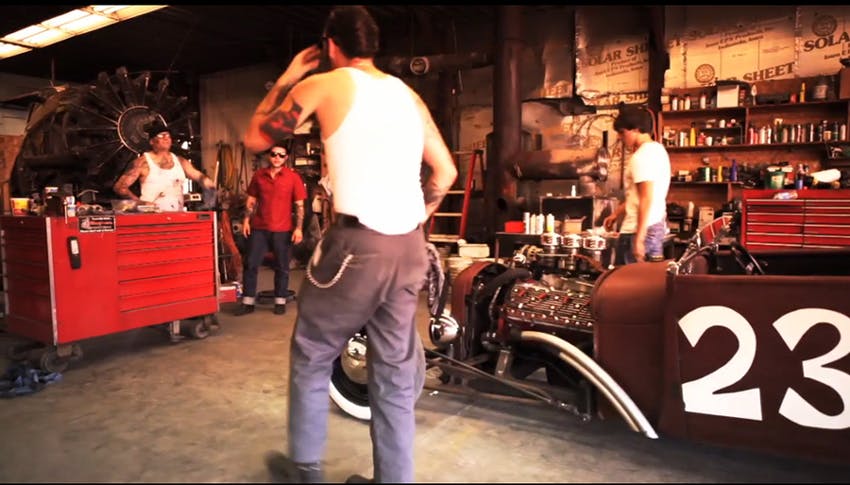 We flash forward to a field or farm party and you find out that the neighbor is also the lead singer of the band. The place quickly fills with some people in appropriate rockabilly attire and some great looking rides. There’s plenty of old trucks, old cars and even an old man watching in the distance from a vintage bike.