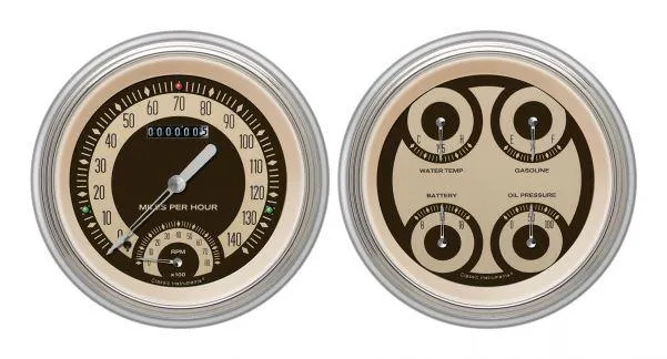 The 1951-52 Chevy package includes a 4 ⅝ in. Quad gauge (fuel (0-30), oil, temp, volts) and the choice of a 4 ⅝ in. speedometer or Speedtachular™ (speedometer & tachometer combination gauge) in any of the fourteen different series. The set includes a red high beam and green turn signal LED indicator lights in the speedometer face, model specific trim rings, mounting hardware, and all necessary sending units. The fuel sending unit is not included. The fuel gauge is calibrated to 0-30 ohms to work with the stock sending unit.
