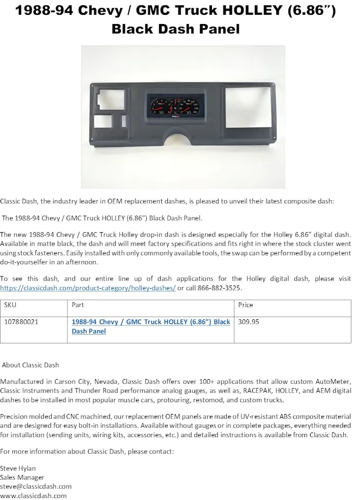Classic Dash has supported the Chevy and GMC truck community from the start with replacement dashes for truck enthusiasts. It is not surprising the company would stay on the leading trends with products like their new Chevy/GMC Truck Holley Dash Panel for 1988-94 Chevy/GMC Trucks.