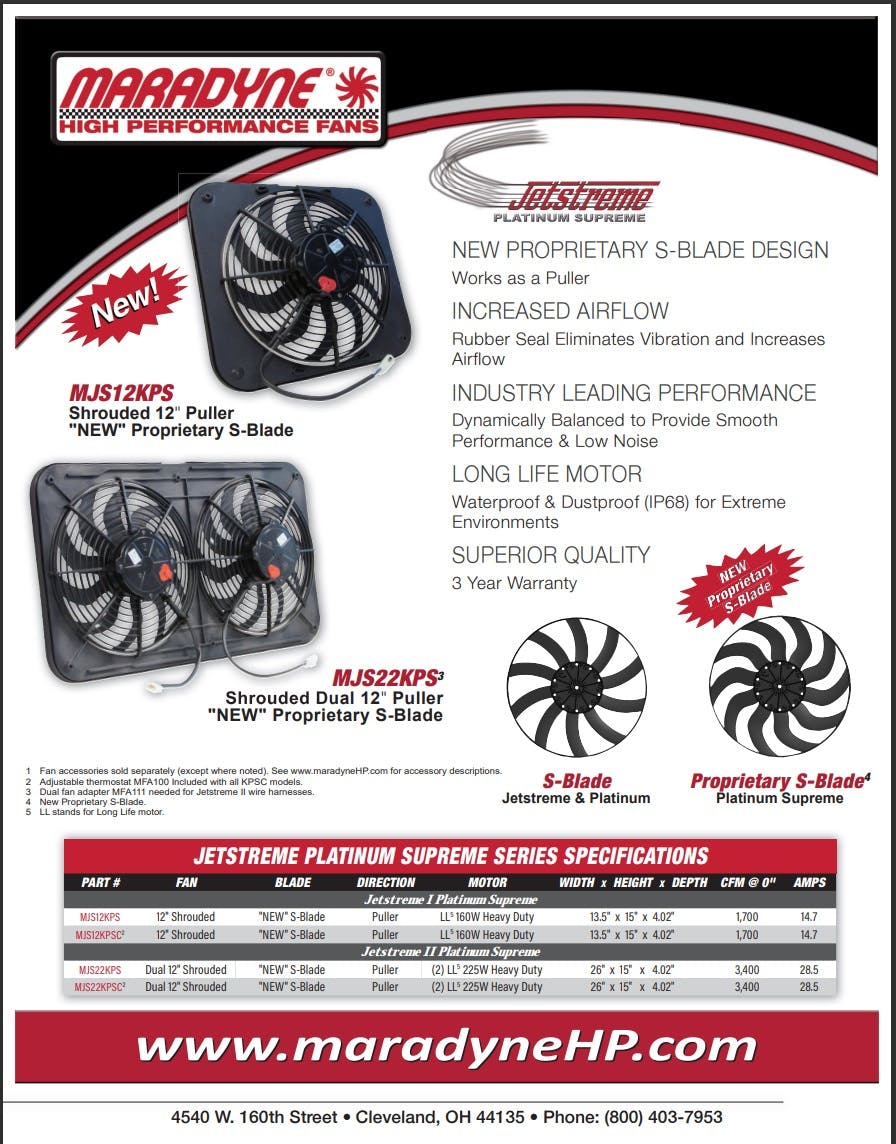 Check out their new offering in the form of a 2” Jetstreme Platinum Supreme. It’s a high-performance, electric, engine cooling fan. The Jetstreme Platinum Supreme comes equipped with the company’s new 225 watt, long-life motor providing an exceptional life span and 1700 CFM of extreme cooling power. Additionally, the blade is engineered to Maradyne’s proprietary Sycle-blade design specifications, running quieter, more efficiently, and moving more air than other comparable S-blade fans. This fan is second to none when it comes to high-volume air movement and hard-core engine cooling. Go here for more details and pricing.