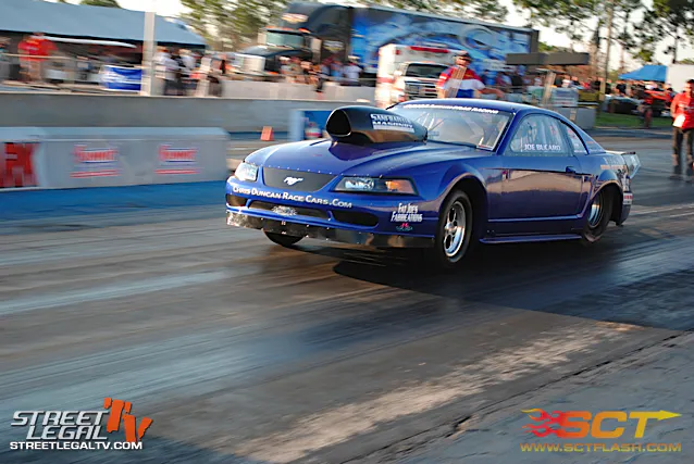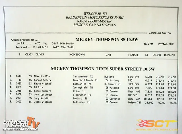 Mike Murillo slowed to a 7.15 @ 166 in the finals of Mickey Thompson Super Street 10.5 against John Lastinger. Lasting had his best run of the weekend with a 7.72 @ 176 but was no match for Murillo's SCT sponsored twin turbo Mustang.