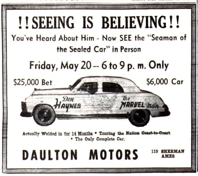 Haynes got himself an advance man and chase vehicle to help with the promotion and upkeep, respectively, of the “Marvel Man” and his white Kaiser as they toured the nation starting in April 1949. Yet, for some reason or another, Haynes was forced to give up two weeks shy of the deadline in April 1950, and unceremoniously had the car’s doors removed.
