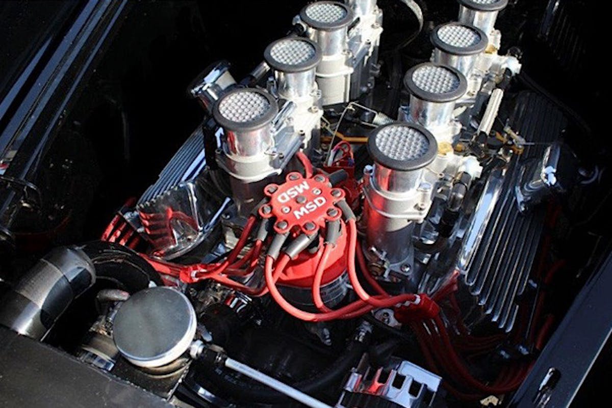A Roush-built Ford 358 cubic-inch V8 churns under the hood of this Model B with electronic fuel injection, MSD Ignition, roller cam and rocker arms, and special custom exhaust headers, all tied to a Ford overdrive transmission.
