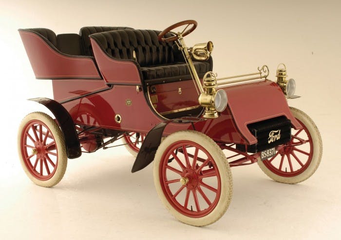 Though not Henry Ford’s first car (that title belongs to the 1896 Quadricycle), the 1903 Ford Model A is the first vehicle to carry the Ford Motor Company name. It is also the car that helped Ford get his start in the automotive business, as the two-cylinder car is the first large order (all of three cars) Ford received.
