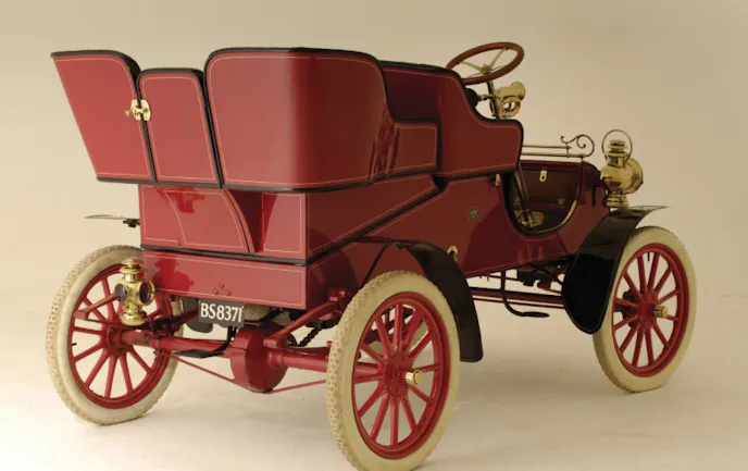 The 8-horsepower opposed-cylinder engine displaced 100 cubic-inches and drove the glorified carriage around on huge carriage wheels and a 72-inch wheelbase. The car has had an interesting history, and originally retailed for around $850, though bidding has gone as high as $325,000 at recent auctions.