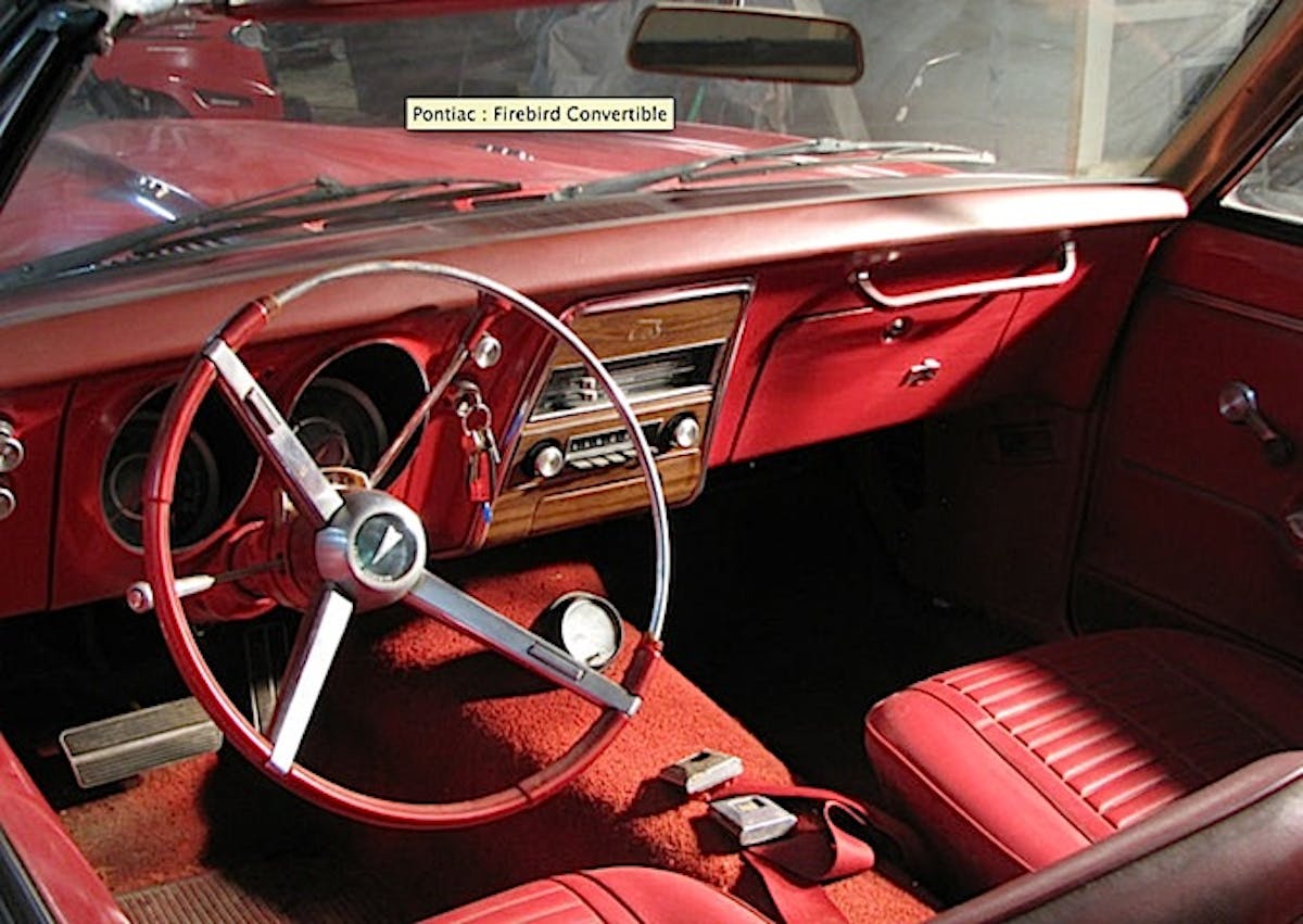 The Firebird convertible on eBay has a VIN #223677U100001, which means it was the first one built at the Lordstown, OH plant. If you pay a visit to firstgenfirebird.org, you can read the data plate and figure out this convertible is a basic Custom 326 convertible painted in Regimental Red with black top and red Custom bucket seat interior, folding rear seat, and a few other options.