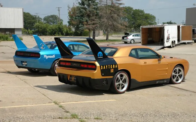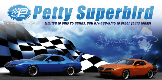 We’ve just received word from Petty’s Garage that they’ll be releasing 25 new “Richard Petty Edition” Superbirds. Each car is based on the new Dodge Challenger and features a Heide Performance Products nose, grille, and rear wing to give it the Superbird conversion. Once that is completed Petty’s Garage will apply either Superbird or Daytona striping, a choice that will be made by the car’s new owner, as well as all of the appropriate Richard Petty Edition badging. You’ll recall that we first saw the “modern” Superbirds displayed by Heide Performance Products at the 2009 SEMA Show, and the Richard Petty Edition is based on those cars.