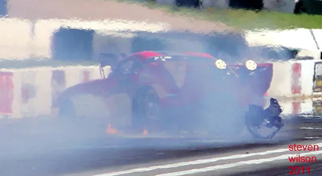 Running in Heartland Park Topeka’s left lane, Smith’s mount lost the No. 1 cylinder and blew apart of the bottom end of the supercharged powerplant before reaching the 60 foot marker, causing the car to catch fire as it continued down the racing surface.