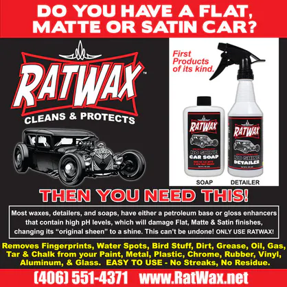 According to the manufacturer’s homepage Rat Wax is, “specifically formulated for rods, kustoms, motorcycles, cars, and trucks with flat, matte, satin, and patina paint finishes. The product line is simple and straight to the point–Rat Wax No Shine Car Soap and Rat Wax No Shine Detailer.