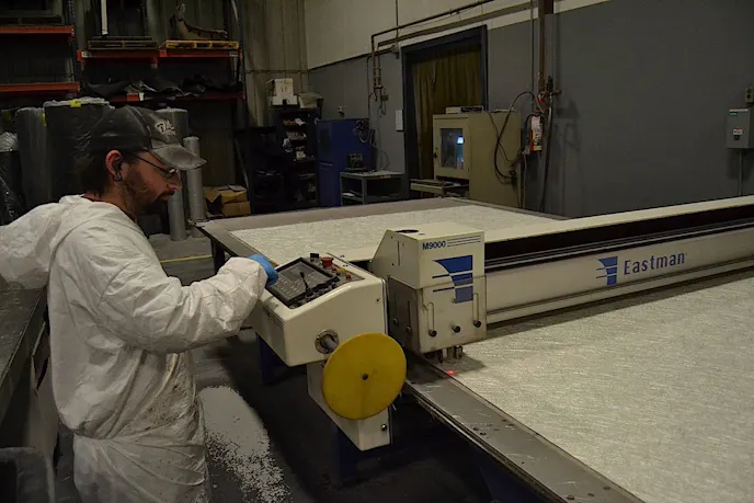 There are typically four or five people working on the body panels and many of the panels have three layers of fiberglass. To add strength where needed, as many as five layers of fiberglass is used on the molds. Each panel is laid separately, and when the panel is ready for trimming a robot is used to cut each panel out.