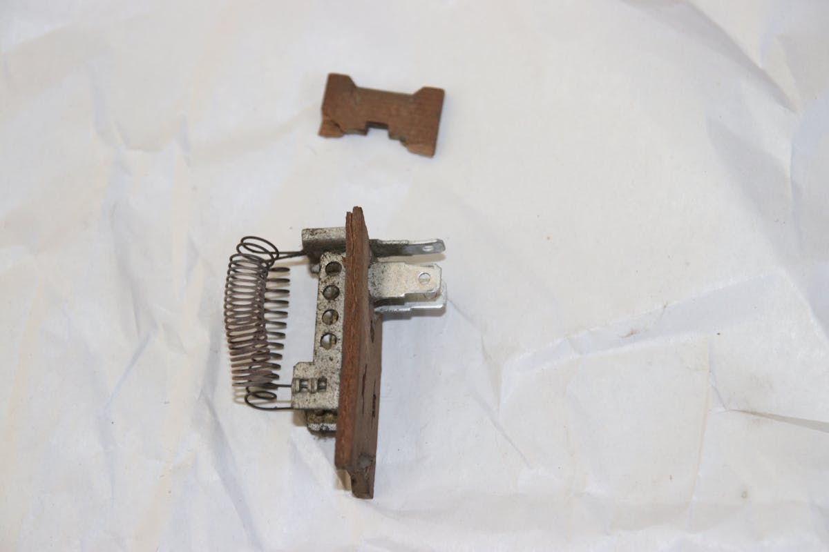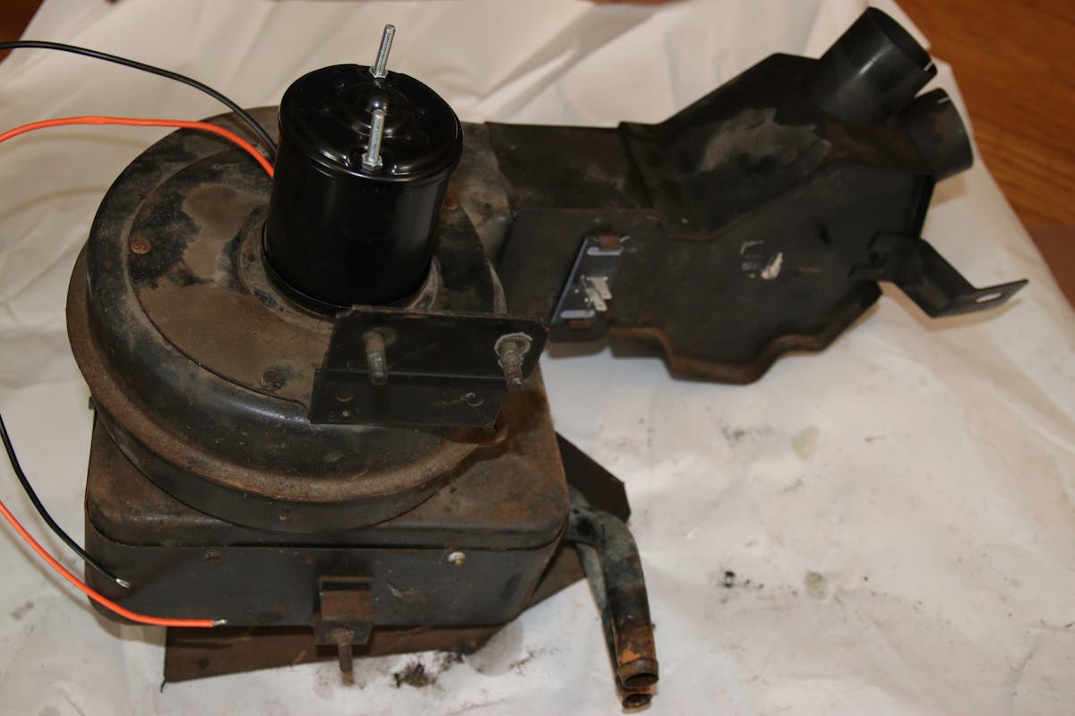 We also noted that the heater blower motor did not work when we bought the truck. So, we pulled the heater box to find out what kind of motor we needed and found a cracked blower-motor resistor. We removed and tested the blower motor, and it failed to work.