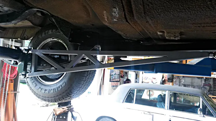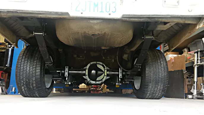 After evicting the mice and spiders, I gutted the car and found the entire car was rust free! I then rebuilt the torsion bar front end and converted it to disc brakes. I’m currently looking for a straight-axle to replace the OEM stuff. I sourced a Ford 8.75 rear end with disc brakes, installed a locker and 3.73 gears, and built four-foot ladder bars and sub-frame connectors. It’s mini-tubbed so 12″ meats fit inside the body.