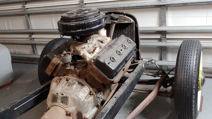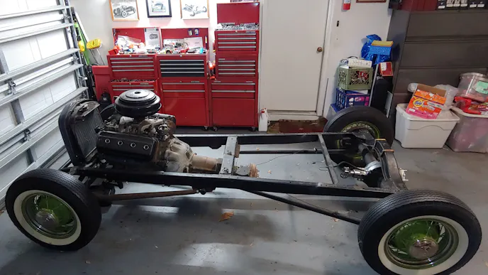 The engine came from my brother in law. It’s a 1956 Desoto 330 cubic-inch Hemi. I mean, who WOULDN’T want an early Hemi in their ride? The engine is currently disassembled, but plans are for a cost-efficient rebuild since the little T doesn’t need much power to those wide-white 6.50-16 tires, ’35 Ford wire wheels, and ’40 Ford banjo rear end. The wire wheels and Banjo steering wheel were a gift from a good friend who was rodding out an original ’35 Ford back in the day. Thank you Steve!