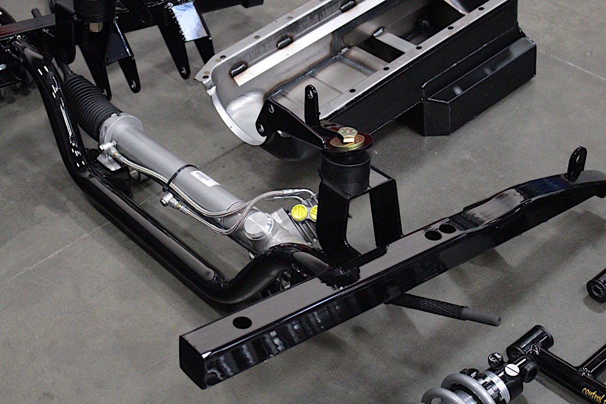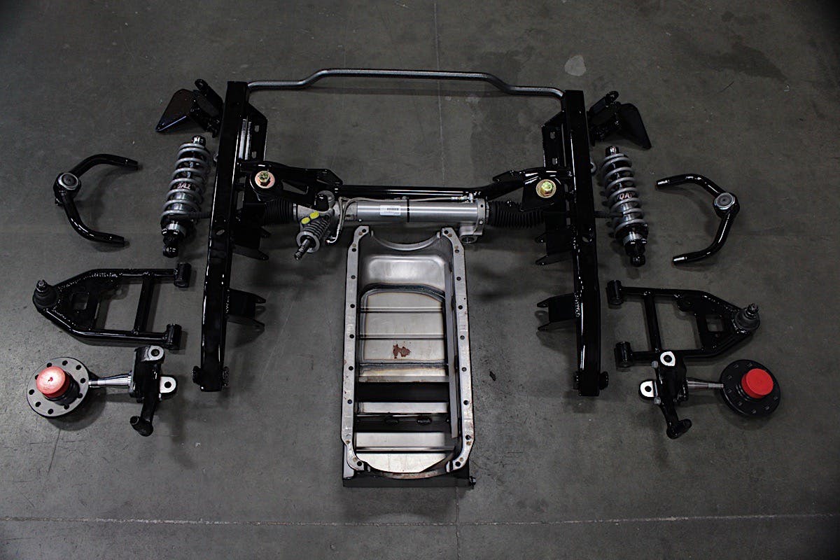 Designed in-house on the latest SolidWorks CAD systems, the system not only provides more caster, camber and ride height adjustment than is possible with the factory suspension system, it also sheds more than 120 pounds of unsprung weight from the front end of the car while also increasing header clearance by the absence of the torsion bars and the swap to the included front steer system.