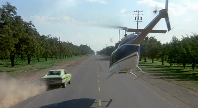 For the majority of their evasion, Larry is wheeling one of the baddest ’69 Dodge Chargers you’ve ever seen! Bright yellow and stolen, are the only two things that seem to matter about the car. Because, it has more than enough power to do anything he wants it to – whether that’s drifting it around city streets or racing a helicopter through an orchard, it just makes you want to get behind the wheel and give it a go. Until he meets his untimely death, that is. Fonda and his cohorts crash that wicked Charger right into an oncoming train.