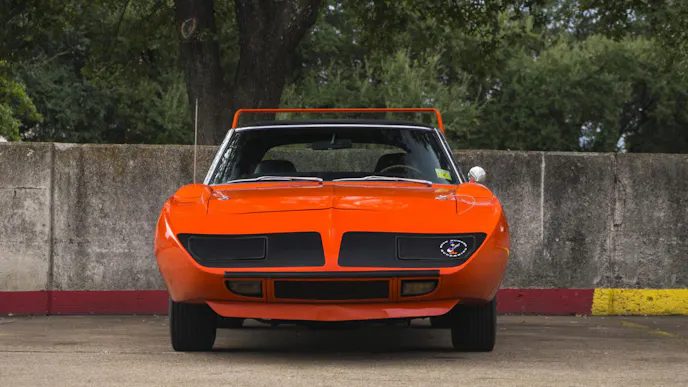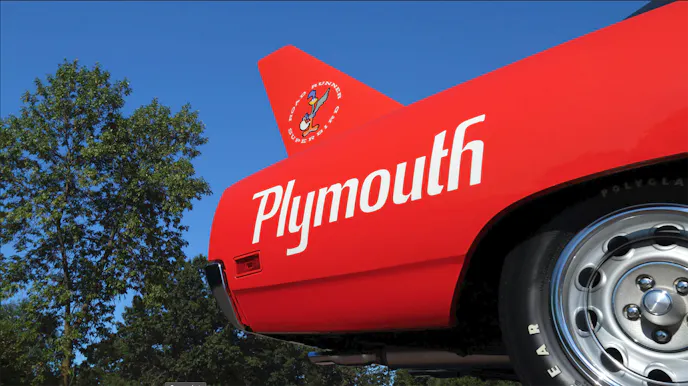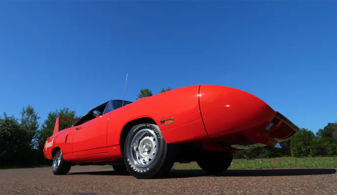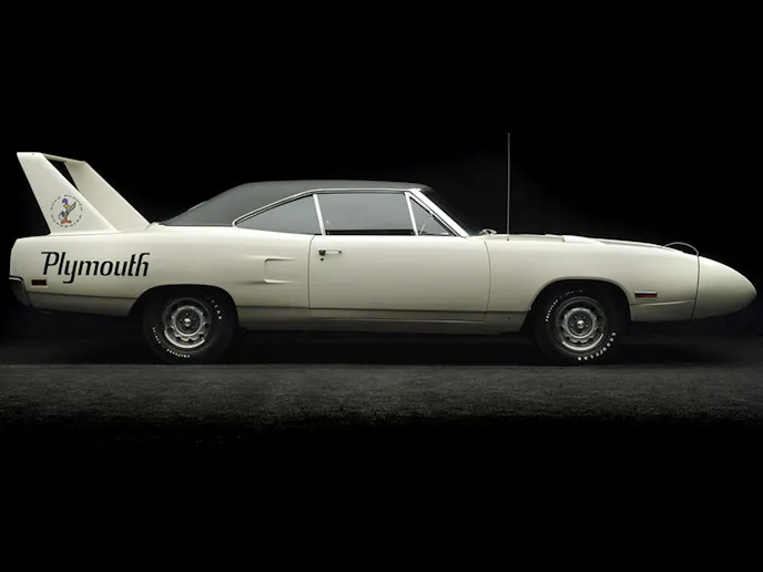 Plymouth designers chose the Roadrunner as the basis for its car – a two-door coupe with a standard FR layout and a B-body platform. They took the Daytona concept and further refined it, outfitting the Roadrunner with sleek, low-drag bodywork including a reshaped nose cone and an even taller rear airfoil.