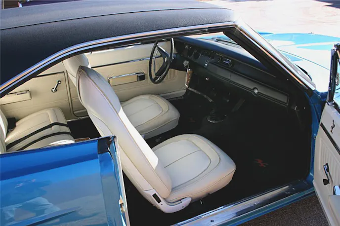 The interior of the Superbird was essentially a stock Roadrunner cabin, though the front seats could be upgraded from the standard bench seat to sporty front buckets available in either black or white vinyl.