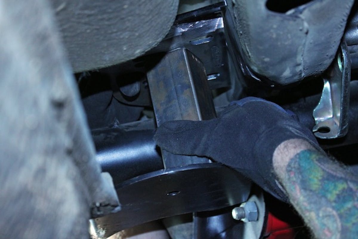 Under the rear of the car, a little more welding was needed to give the air springs a place to mount. Thankfully, Ridetech included the necessary brackets for the top of the springs, just like the lower mounts already welded on the rear end. For our application, we found the best way to mount the springs would be to modify the mount slightly, by altering the gussets to match the curve of the frame rail.