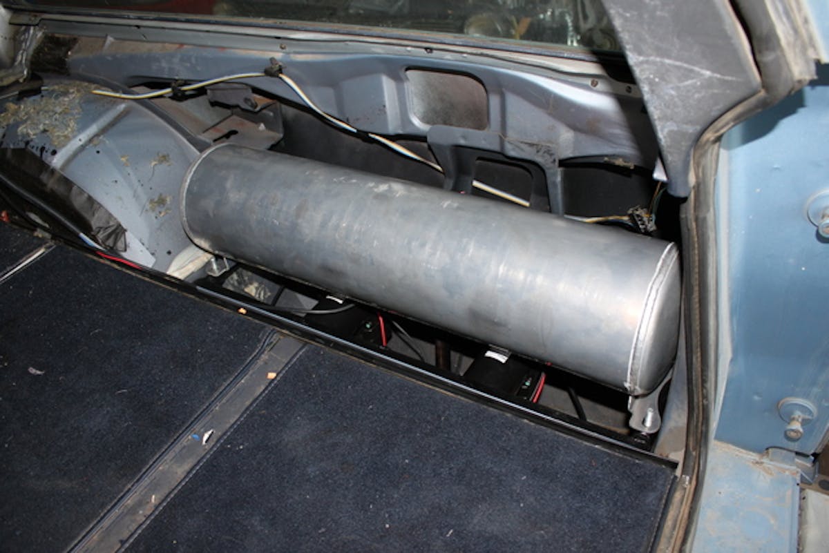 On the opposite side of the car sat the spare tire. With no need for the 30 year old rubber, we built another mount using some angle-iron and round tubing to mount it’s place. After some carefully placed bolts were welded on, we were able to mount both compressors underneath the air tank, and keep it all hidden behind the factory dress up.