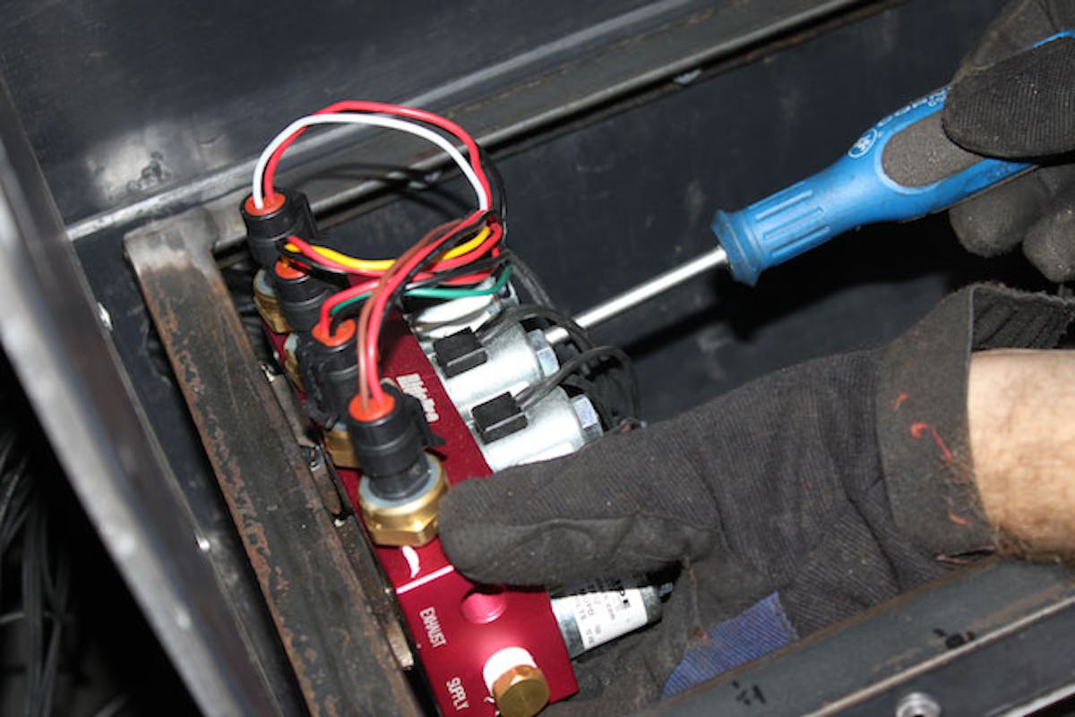 After attaching the brass fittings to the various ports on the valve block and air tank, we wired in 12-volt power and a trigger wire coming from ignition-on from under the dash. Then, plugged in all the wire connectors and air lines. Routing the air lines throughout the car is simple, just avoid hot components such as compressors and exhaust tubing. Sharp bends that will kink the air line, and sharp edges should be avoided as well.