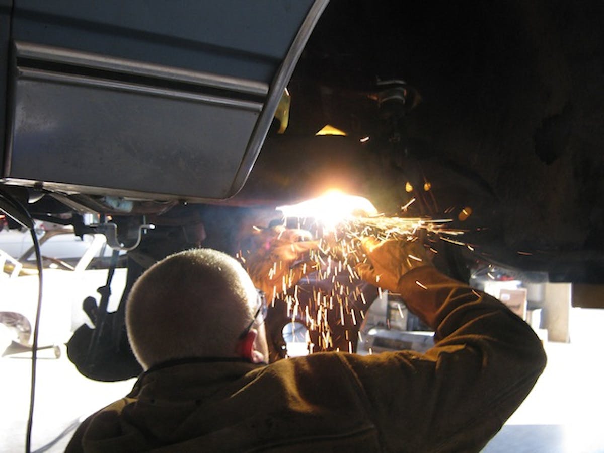 Under the rear of the car, a little more welding was needed to give the air springs a place to mount. Thankfully, Ridetech included the necessary brackets for the top of the springs, just like the lower mounts already welded on the rear end. For our application, we found the best way to mount the springs would be to modify the mount slightly, by altering the gussets to match the curve of the frame rail.