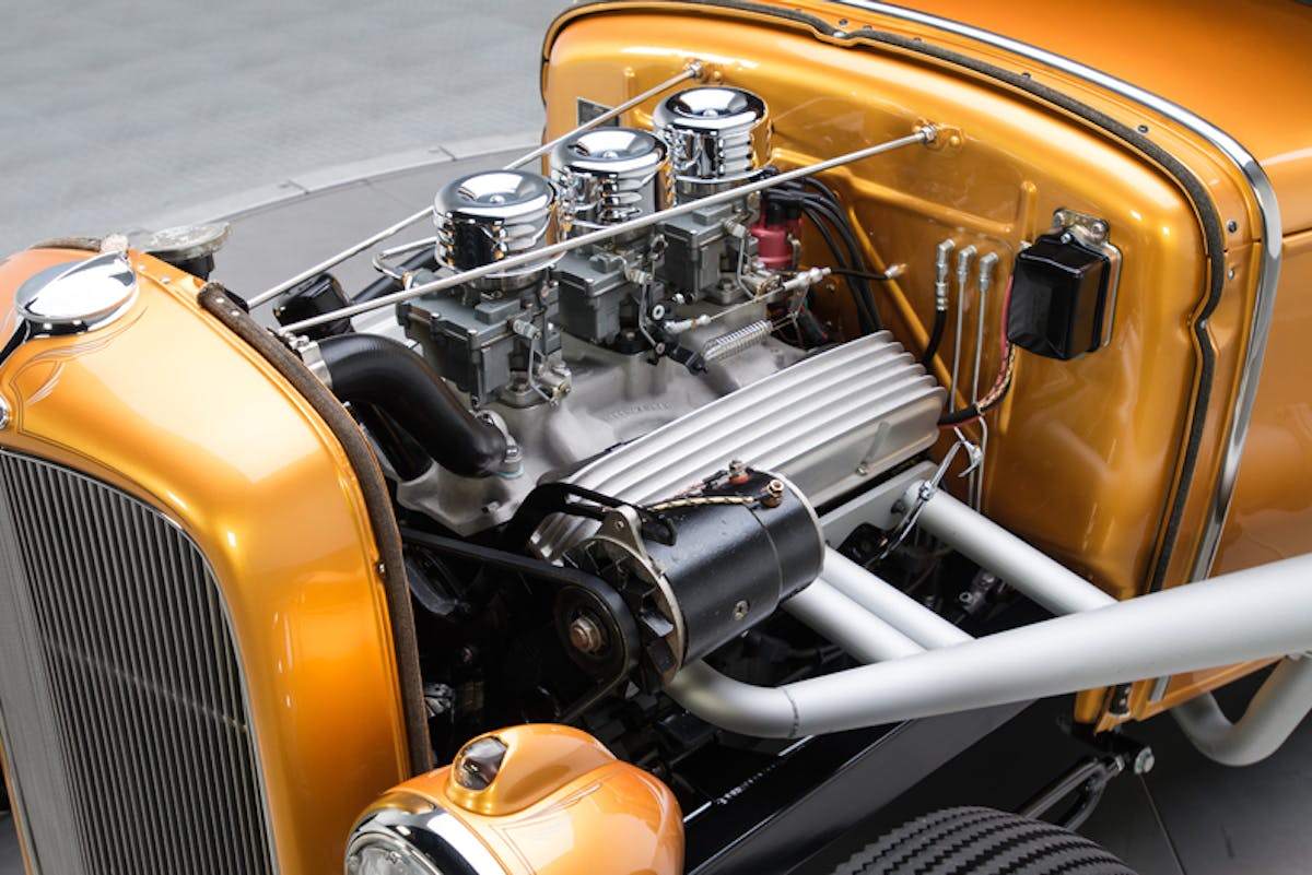 All of this keeps the 16-inch painted wheels wrapped in Firestone Deluxe Champion whitewalls perfectly splayed on the ground while early Lincoln drum brakes are used in the front and Ford 10-inch drums are used in the back for stopping power.