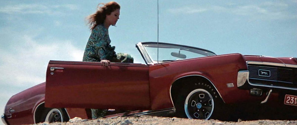 The car she is driving, a 1969 Mercury Cougar XR7 convertible, is an elegant, but untamed beast of a muscle car, likely chosen to illustrate and accentuate the character’s polished yet reckless visage and demeanor.