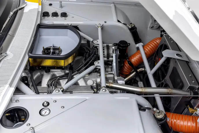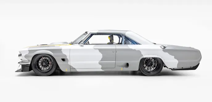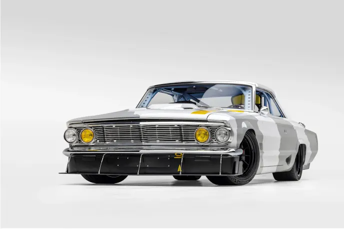 According to Ashton, “Our 1964 Galaxie 500 represents the closest to a full race car on the street that we are willing to go. It is built on top of a Ron Sutton-designed, full-tube race chassis with a flat belly pan and full-size diffuser. It’s powered by Shelby’s 700hp, 526 ci aluminum block Ford FE and backed by a GForce-built t56 six-speed manual transmission with dog ring first through fourth gear.” Air jacks are built into the chassis for quick tire changes. The car has a 50/50 weight distribution and cross weight thanks to the motor being pushed back 10 inches and offset to the right one inch.