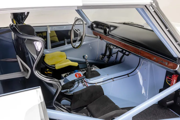 Up front, the stock fenders have been stretched to accommodate massive 325mm tires on 20-inch multi-piece wheels. Expert Galaxie spotters will note the “diet” front bumper, cleverly crafted from two welded top halves. An aggressive air splitter slices through the air, matched by a racing diffuser at the rear.