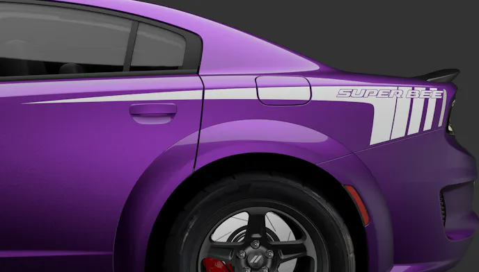 - Super Bee exterior graphics on the functional hood scoop and rear fenders (blue graphics with B5 Blue, white graphics with Plum Crazy)