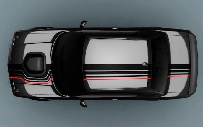 Look for a shaker hood scoop, three off-center glossy black stripes of varying widths, and a single thin red stripe for accent. Red “392” badging matches the red Brembo brake calipers.