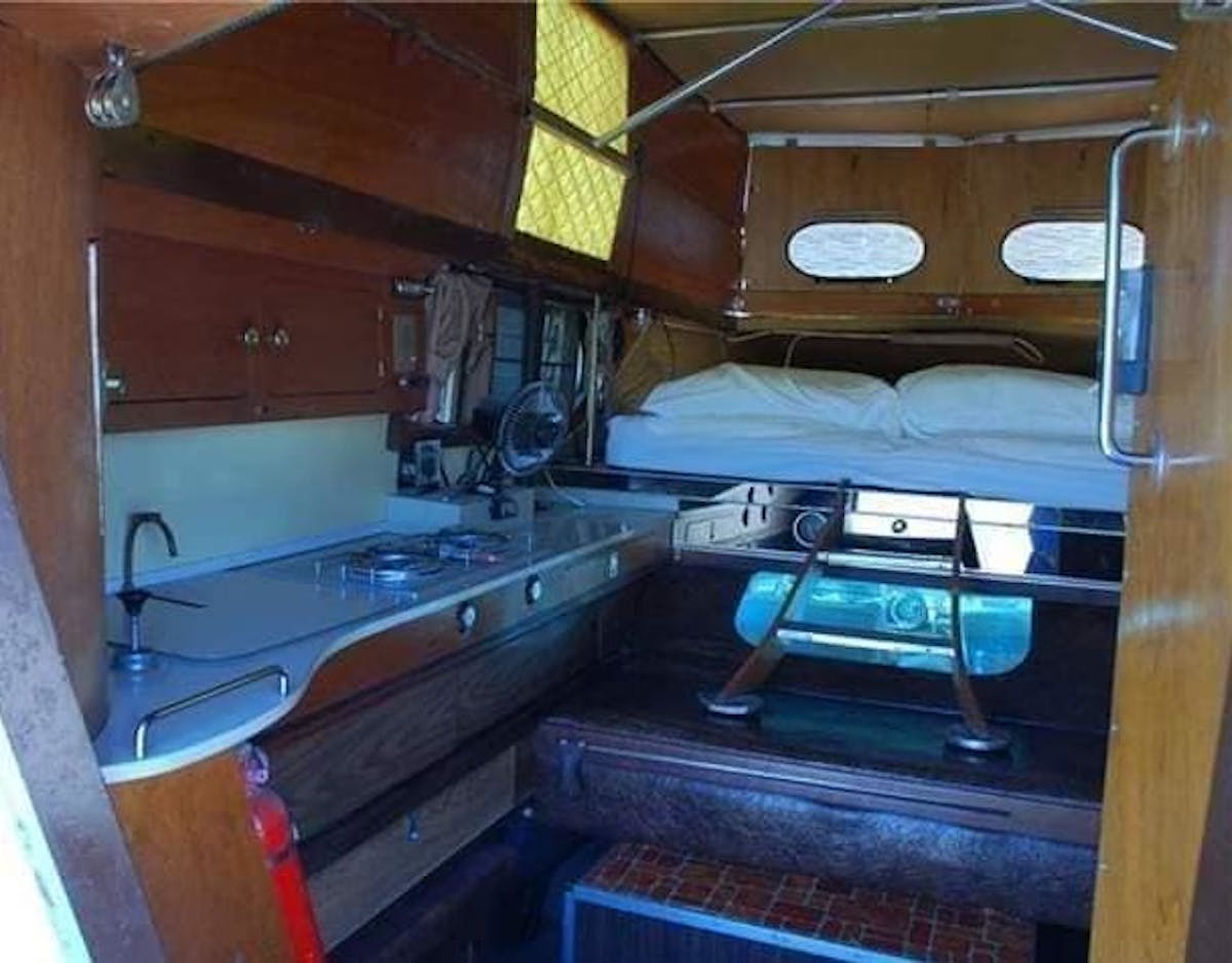 The camper was designed in the mid-60s and was a Golden Hammer winner featured in the January 1965 issue of Mechanix Illustrated. The builder was an interior designer for the aircraft industry for many years, which influenced the well-thought-out design of this camper.