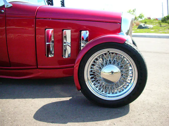 The louvre work was the product of melding both custom metal-working with the hood sides of a ’32 Chevy. A neat feature is the ’32 Chevy louvre’s ability to be manually opened and shut to allow control of air flow through the engine compartment. The contrast of opened chrome louvres against the “Strawberry Jewel” body paint is simply stunning.