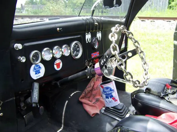 To the right buyer, all of that might be pretty impressive, but our favorite pieces on the Studebaker have to be the Ford tailgate that has been crossed out by what appears to be painters tape, the yellow knock-off wire wheels and best of all the Pabst blue ribbon can that looks as if it acts as the shifter boot. Regardless how you feel about the build, you have to admit it takes a lot of nerves to roll up your sleeves and turn an old Studebaker into this Frankenstein.