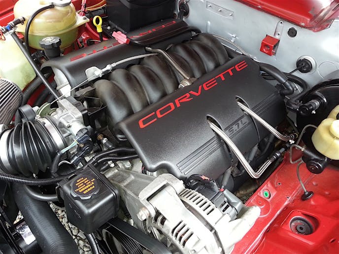 Bob tells us that the Corvette motor sits very well inside the engine bay, and that everything on it is completely accessible. As for the rest of the drivetrain, a 4L60E stands in for the original 3-speed automatic, but the driveshaft and rear end are as they came from the factory.