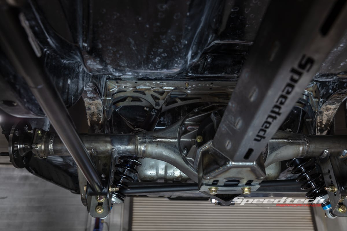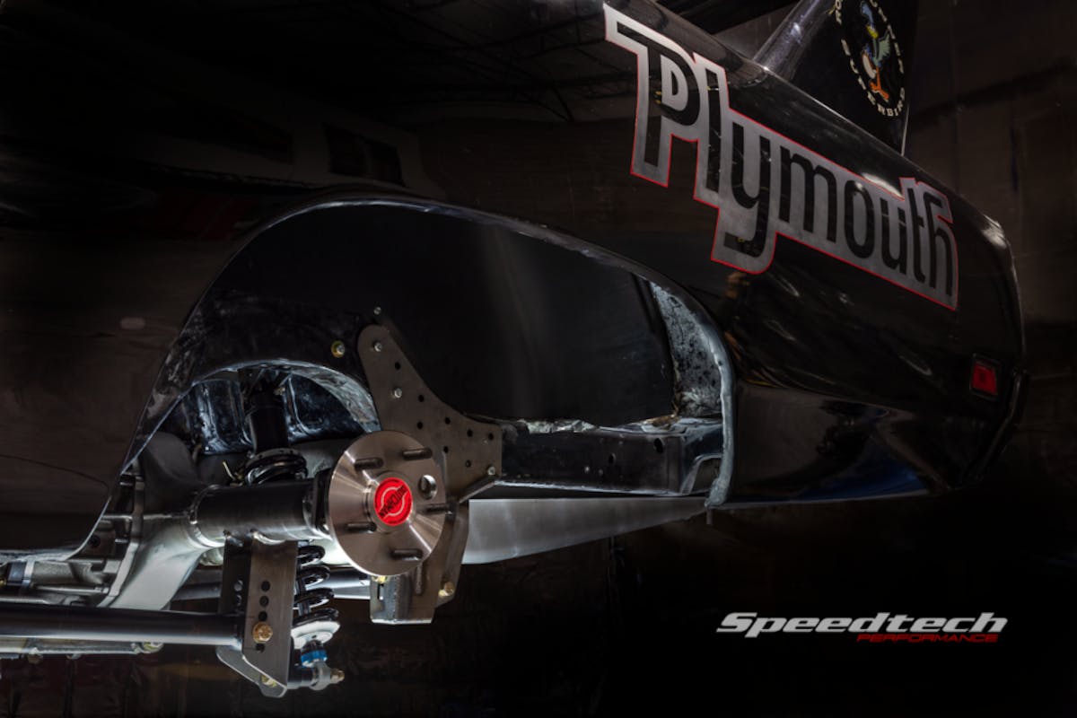 For the first time, the rear of Mopar B-body can now receive Speedtech Performance’s proven Torque Arm Rear Suspension, (TARS).  Many benefits of the TARS include eliminating suspension bind, maintaining a constant pinion angle, transferring load forces from acceleration and braking to the center of the car, and successfully managing movement of the body on the pitch axis. The Articulinks and Delrin torque arm bushings optimize performance from the axle housing, enhancing comfort and performance. Fitting a 335/30/20 in the rear will require mini-tubs, with no exterior body modifications.