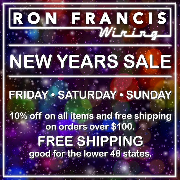 While the rest of the world is tuning up to sing Auld Lang Syne, you could be making progress on your next project by clicking your computer’s mouse on the Ron Francis Wiring products you’ll need to get your ride ready by spring. Ron Francis will give you 10% off your order if you order between 3:00 PM Eastern time on Thursday 12/31, and 8:00 AM on Monday 01/04 Eastern time. So, from the time they shut the lights off on Thursday until they come back in on Monday morning, any orders slid under the door (electronically, of course) will receive 10% off!