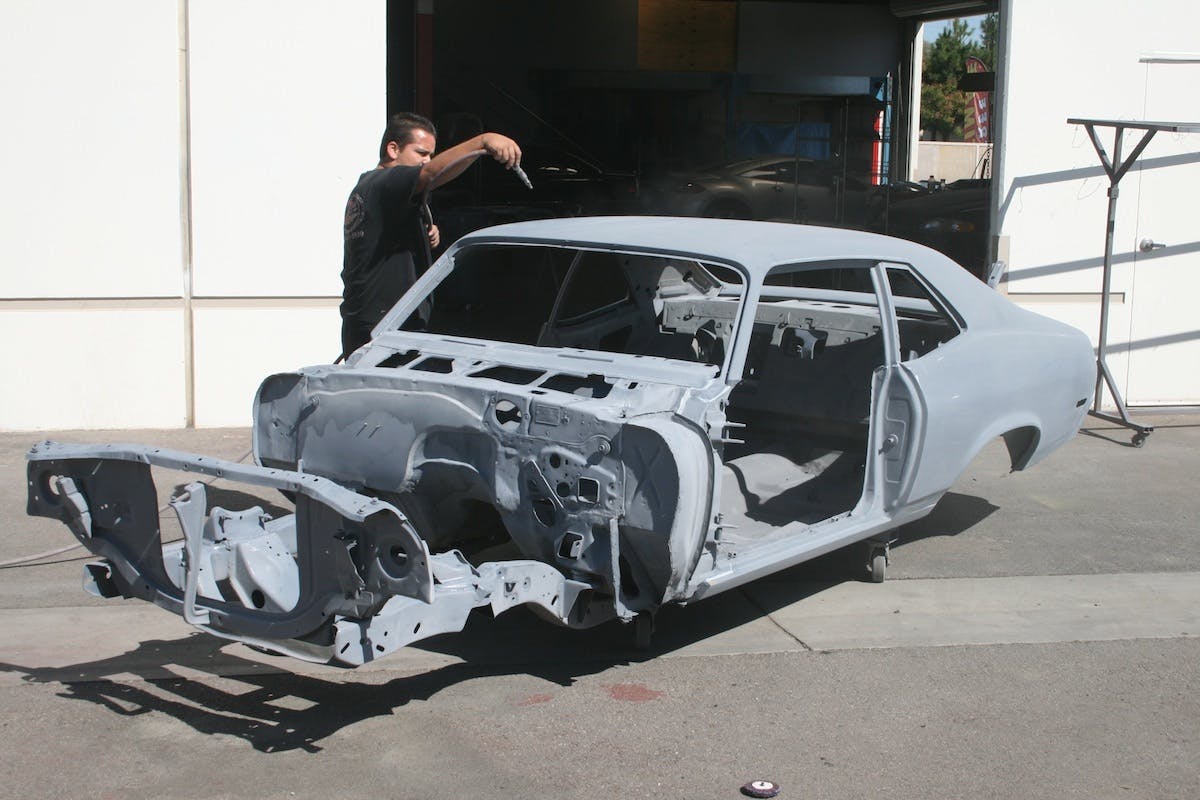 It’s commonly understood that those nefarious “one-day” shops can give you a “10-footer” for under $1,000, but will be plagued with orange peel, wavy body lines and a miserable final finish rife with swirl marks, sanding scuffs and high and low points. Knowing that our Project Swinger Nova deserved much more than a quickie paint job, particularly with all the killer parts this car has and will have, and based on our aspirations for the final piece, we knew the car needed to have a pro-quality paint job, so we went to Lake Elsinore, California’s ZBest Body & Paint to help us get it.