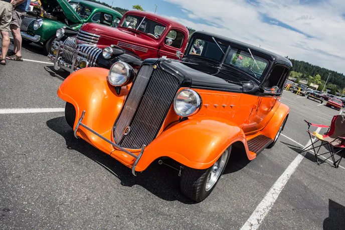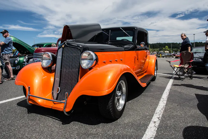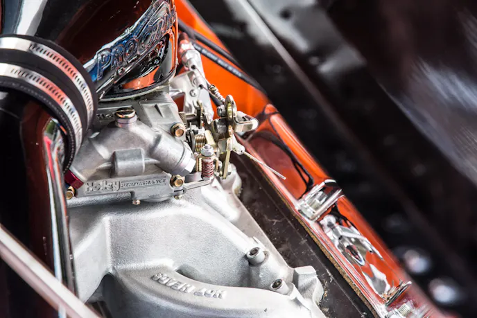 When we saw this 1933 Chrysler Imperial and the chrome-clad Chrysler Firepower wedged under the hood, we had to talk to the owner and find out more about this awesome ride. The orange and black paint caught our eyes from across the show, and the shining engine compartment drew us in even closer. There are a few surprises lurking under the hood of this Mopar hotrod.