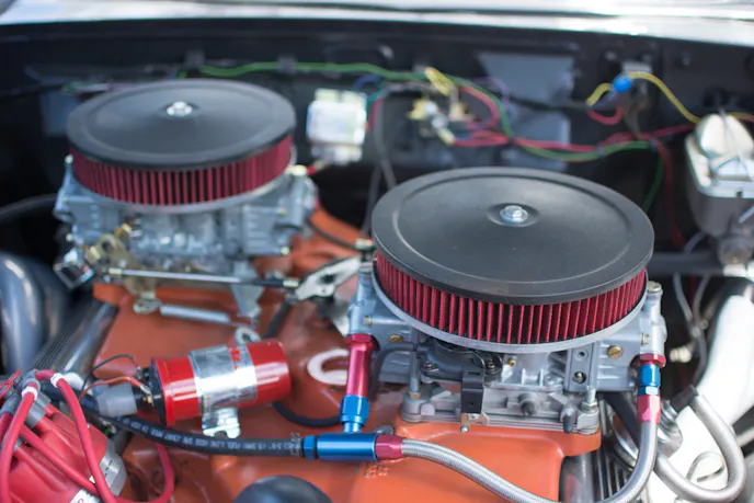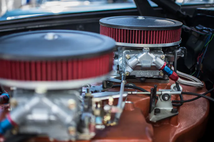 The engine is fueled by way of a cross-ram intake manifold and two 750cfm Holley carburetors—a high performing combination that is definitely one of the best looks for a motor. The offset carburetors look awesome, but It’s more than just the look. This unusual fuel system packs a punch that will burn rubber without a sweat.