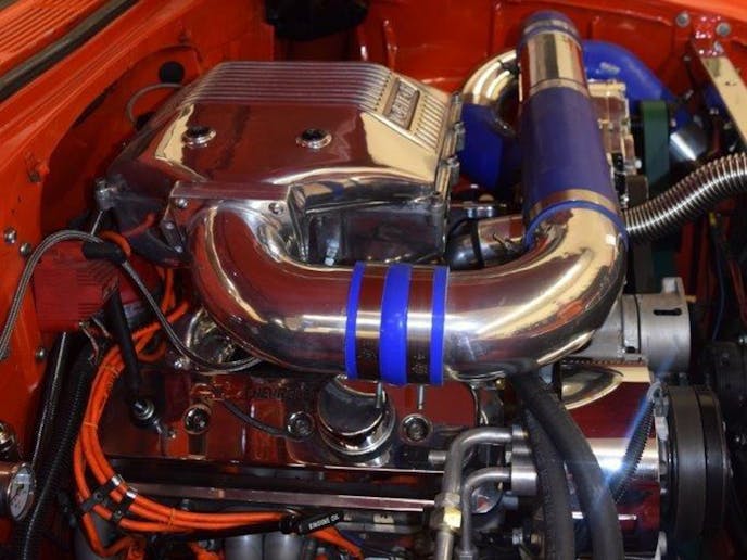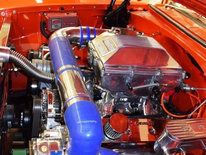 This build features a 700 horsepower 383 cubic-inch stroker motor with Arias pistons, a roller camshaft, aluminum heads, MSD ignition, and a Vortech centrifugal supercharger. The drivetrain is followed up with a Richmond six-speed transmission and Ford 9-inch positraction rearend with 35 spline axles.