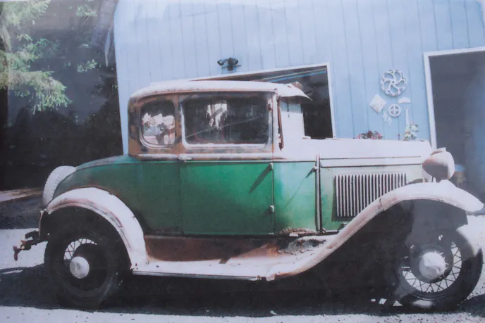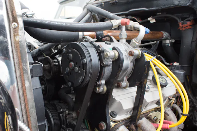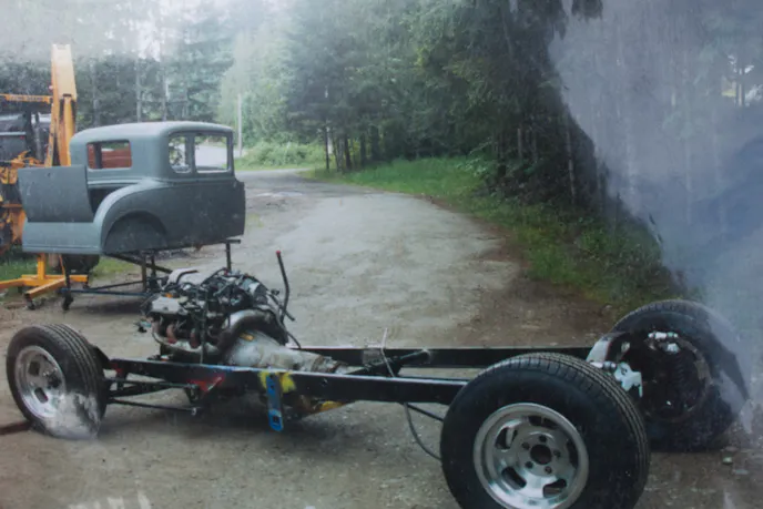 The entire body of the car is steel, you won’t find any fiberglass on this build, but Fred replaced it with all new steel when he built the car. When he started the project, he sandblasted, boxed, and refinished the frame. He also added front disc brakes, ladder bar rear suspension, and retrofitted the air conditioner from the Buick under the cowl of the Model A body.