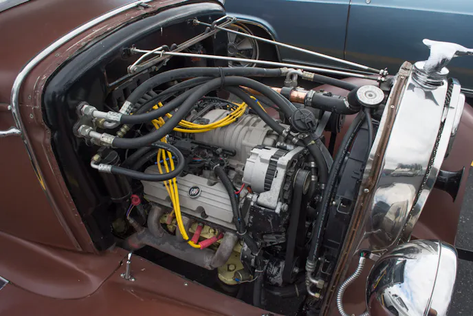The unusual power plant in this Model A is really what caught our attention. The engine is from 1996 and it’s a 3.8 liter Buick V6 with a blower. The ’96 Buick that it came out of was of course front wheel drive, so in order to get the rear wheel drive system of the Model A build to work with the new motor, the engine and transmission had to be rotated 90 degrees in the car. The transmission is a 700-R4 and the drivetrain is completed with a 10-bolt rearend.