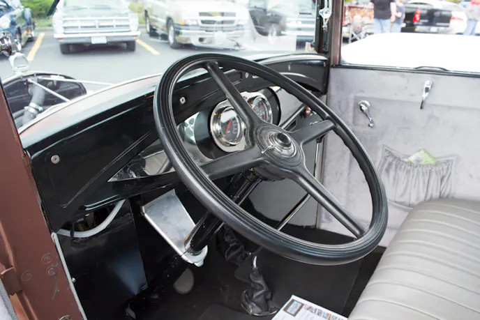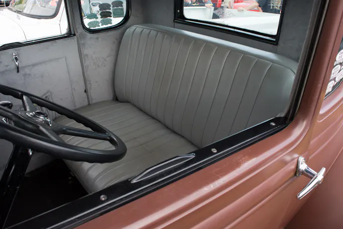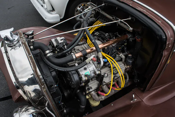 While he did keep the Model A steering wheel, he put in all new gauges. The car is technically unfinished, and displays only a brown primer color on the exterior. While we thought that was an intentional look, Fred revealed that he had actually intended to paint it, but everyone just told him to leave it, including his daughter, whom he says will end up with the car someday.