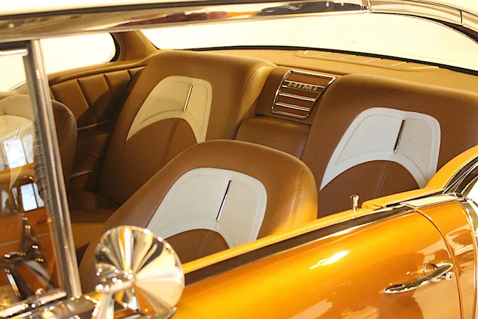 The interior was a custom job done by a friend of Bob’s that usually does boat upholstery. “He has the vision to do something different,” Bob explained. And that is what he wanted. The front seats are from a 2008 Saturn and the back seat is out of a ’64-’68 Impala with the center speaker grill. The interior is also lined with a material called Luxury Liner to dampen the noise. “You drive that car and it feels like a Cadillac,” Bob told us. “It’s soft and it’s quiet.”