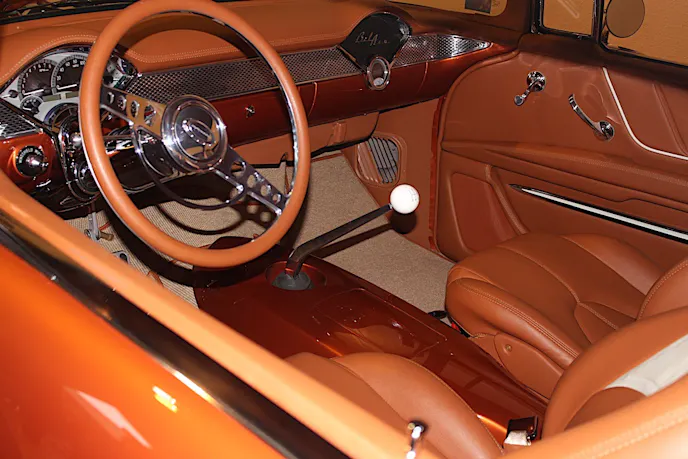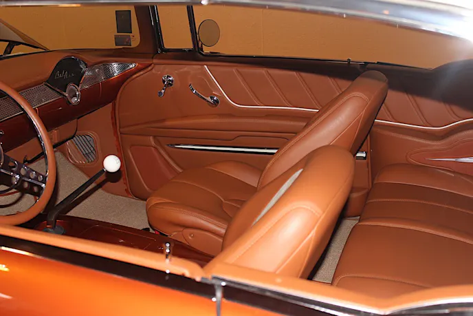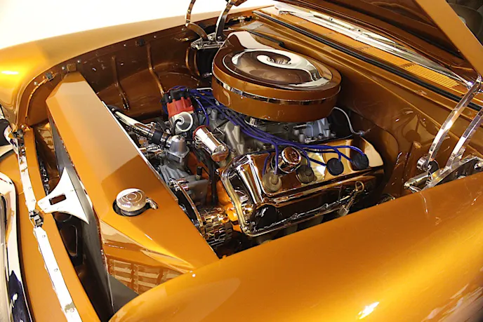 When everything was said and done, bob had his car painted the same orange as his 2007 Corvette with a Chrysler cream color for the upper rear. He dressed up the motor with a single carburetor to get exactly the look and sound he wanted, and he used a corvette air cleaner that would sit low on the carburetor to fit snug under the hood.